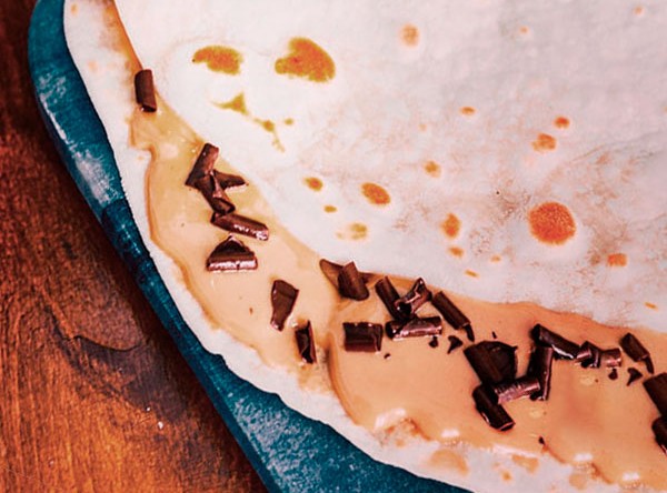 E a nossa novidade são as Piadinas Doces, e nosso sabor especial é de Manteiga de Amendoim com raspas de chocolate!